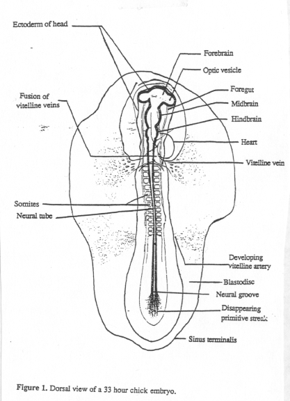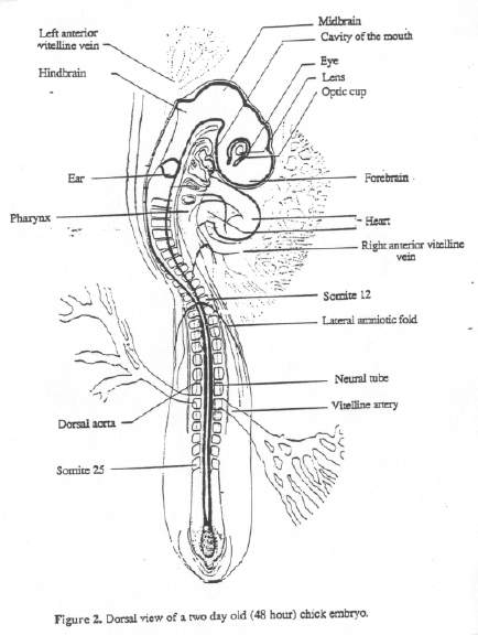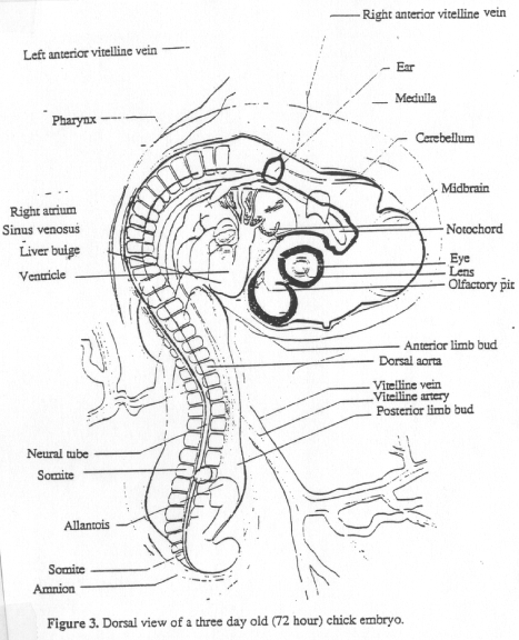 Diagrams of 33-, 48- and 72-hour chick embryos